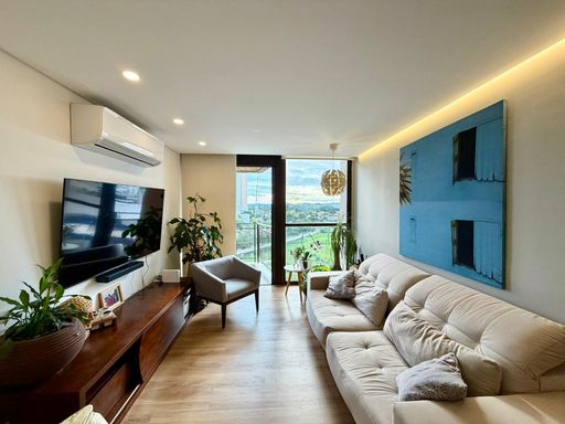 • Sala ampla para 2 ambientes, com ar-condicionado e sacada com linda vista livre para a serra e pôr do sol