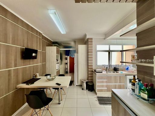 Cozinha totalmente planejada, com área de serviço independente e banheiro de apoio.