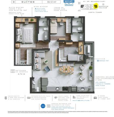 Apartamento 83 m², 31º andar, com vista deslumbrante da cidade e da Serra.