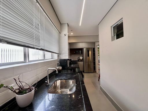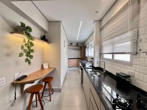 Cozinha totalmente planejada e equipada, integrada à área de serviço