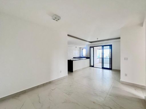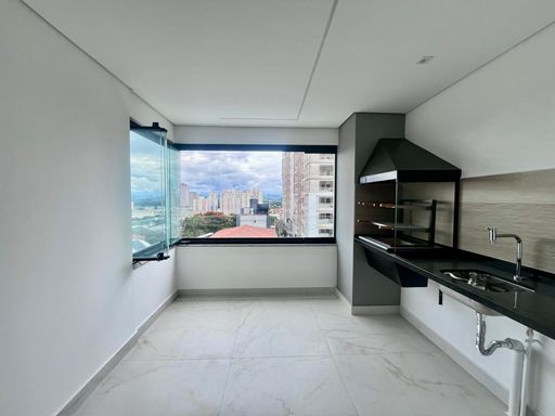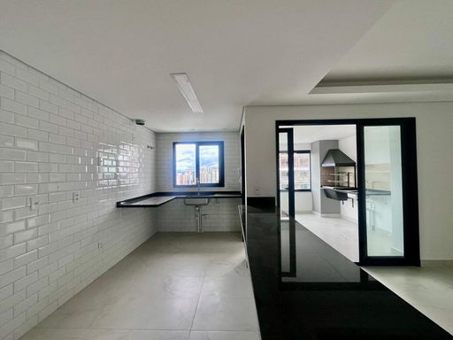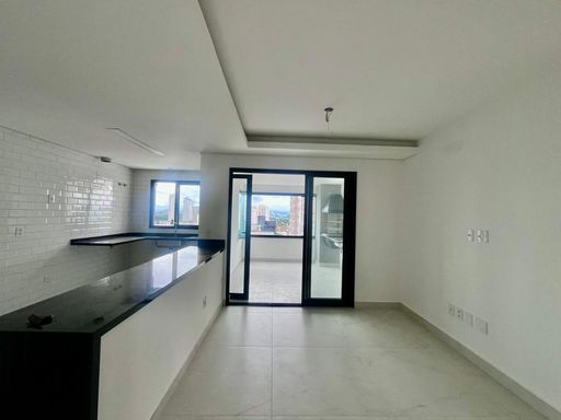 A sala ampla para dois ambientes é integrada à varanda gourmet com fechamento em vidro, ideal para receber amigos e familiares com conforto e uma vista agradável.