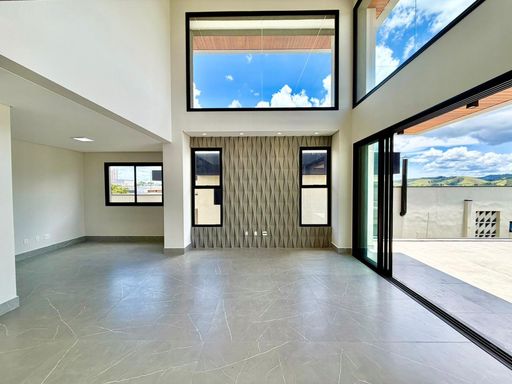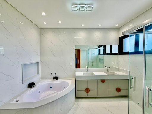 4 suítes, sendo uma suíte master no mezanino, com sacadas ao redor, closet, banheiro com hidromassagem e jardim suspenso;