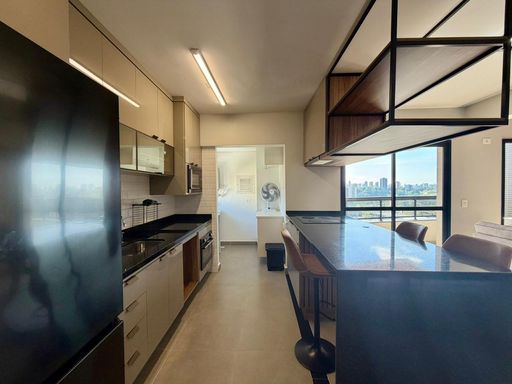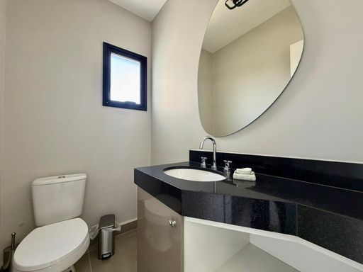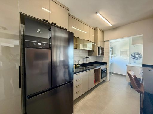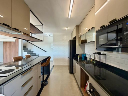 A cozinha é completa e equipada com eletrodomésticos: cooktop, coifa, forno elétrico, micro-ondas, geladeira duplex, liquidificador e air fryer. Conta ainda com lavabo.