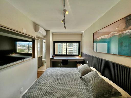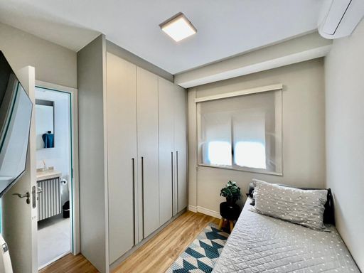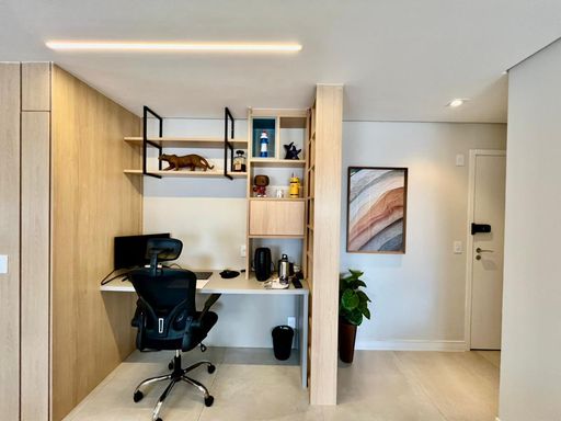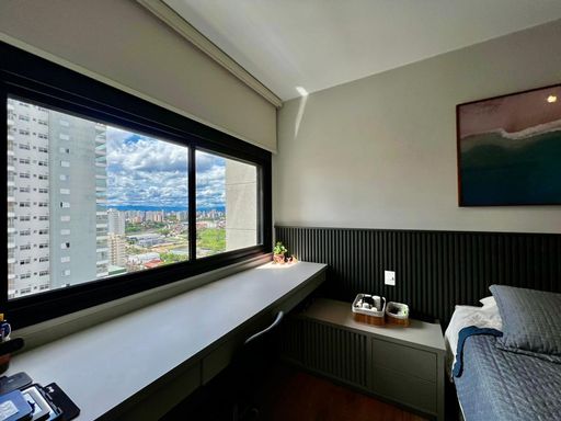 São 2 suítes com armários planejados e ar-condicionado, sendo a suíte principal com bancada para escritório ou estudos, ideal para a rotina moderna.