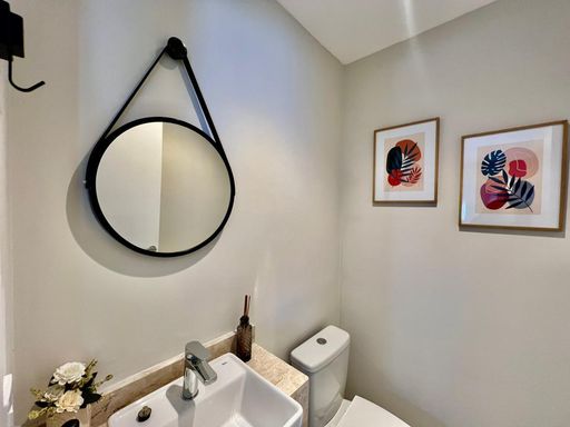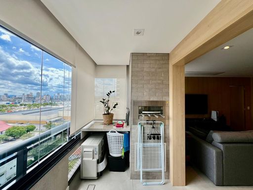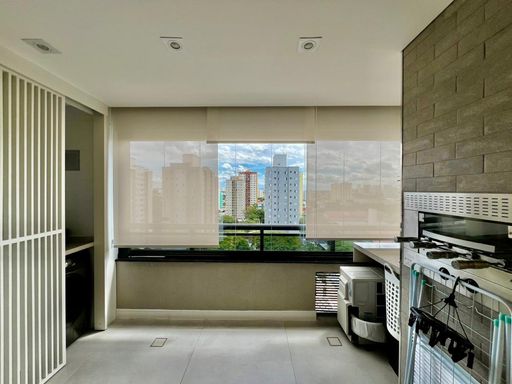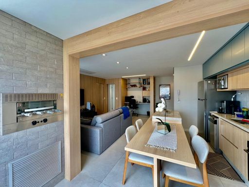 A sala ampla para dois ambientes, muito bem iluminada, conta com ar-condicionado e lavabo, atualmente adaptado com bancada ideal para home office. Todo o espaço é integrado à cozinha e à varanda gourmet com fechamento em vidro, garantindo conforto, praticidade e excelente aproveitamento dos ambientes.