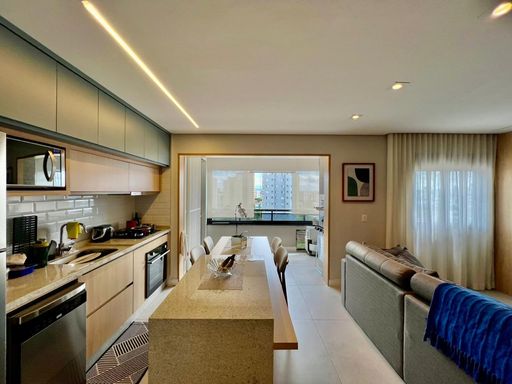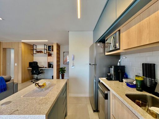 A cozinha com ilha é um verdadeiro destaque: repleta de armários planejados, equipada com cooktop e forno elétrico, perfeita para quem valoriza funcionalidade, design e convivência.