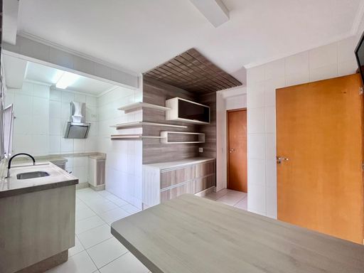 Cozinha repleta de armários planejados, equipada com fogão e coifa