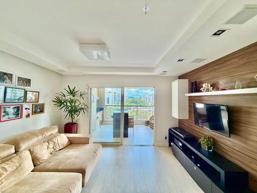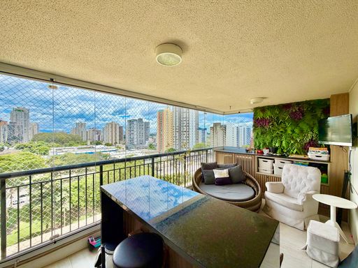 Sala ampla para 2 ambientes, com lavabo e ar-condicionado, integrada à espaçosa varanda gourmet com fechamento em vidro.