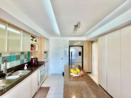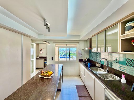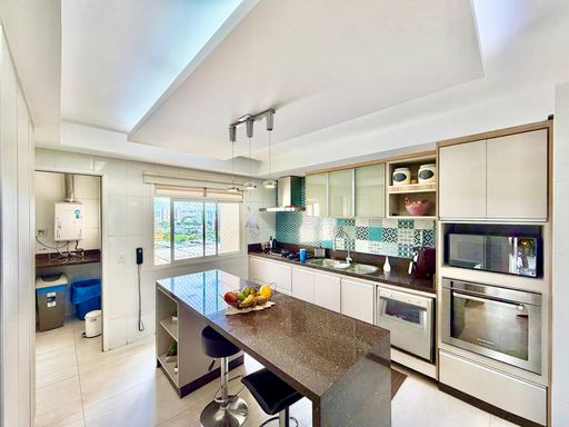 Cozinha totalmente planejada e equipada com cooktop, forno elétrico e coifa, além de área de serviço bem arejada.