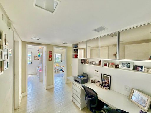 Hall íntimo entre os dormitórios com escritório planejado, ideal para home office.