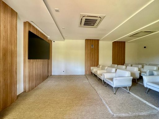 - Sala ampla para 2 ambientes, com lareira e ar condicionado;