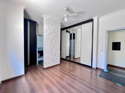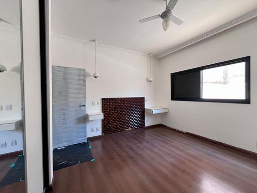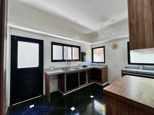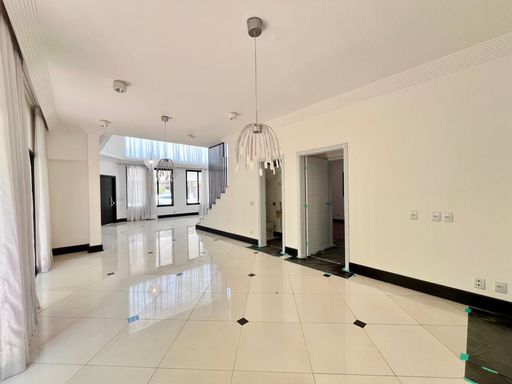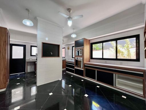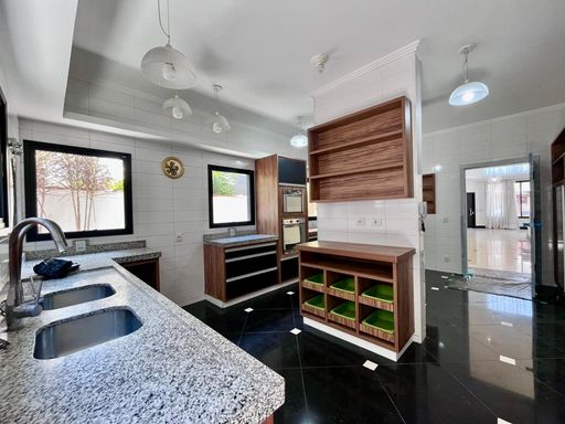 Piso térreo com 2 suítes (máster com closet e banheiro duplo + suíte com banheira), sala de estar com pé-direito duplo, sala de jantar, lavabo, cozinha planejada, copa, despensa e área de serviço com suíte de empregados.