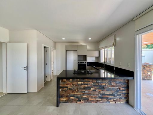 Cozinha planejada com bancada em mármore, cooktop e forno elétrico, integrada à varanda gourmet