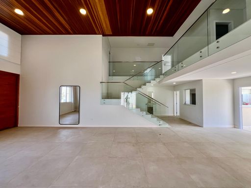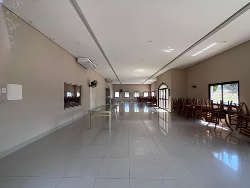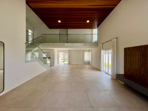 Sala ampla para 3 ambientes com pé-direito duplo, em piso porcelanato, bem arejada e iluminada